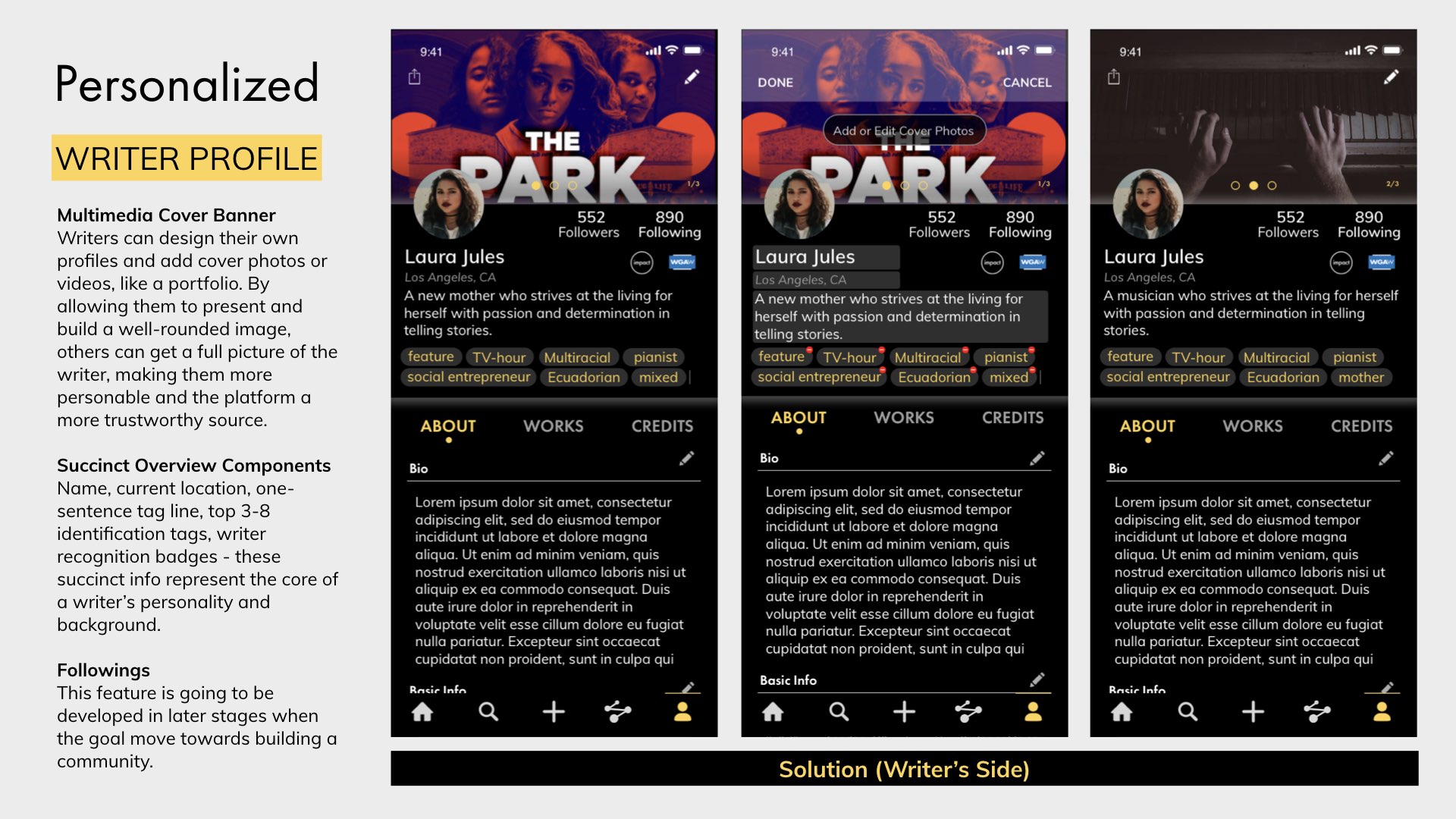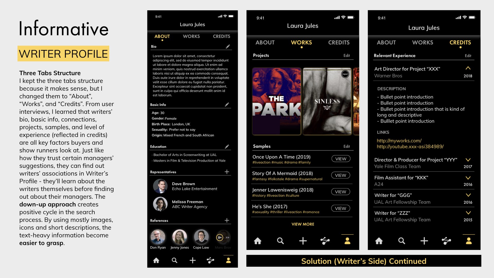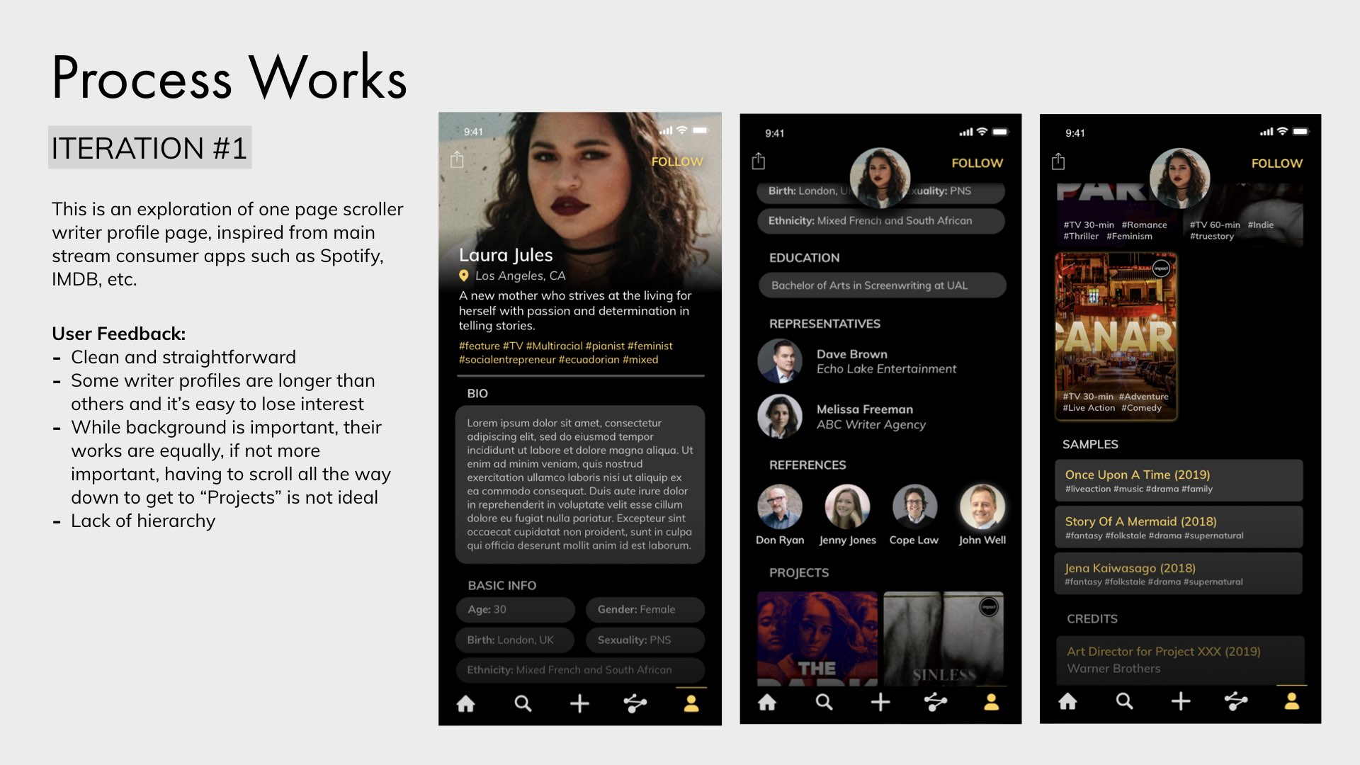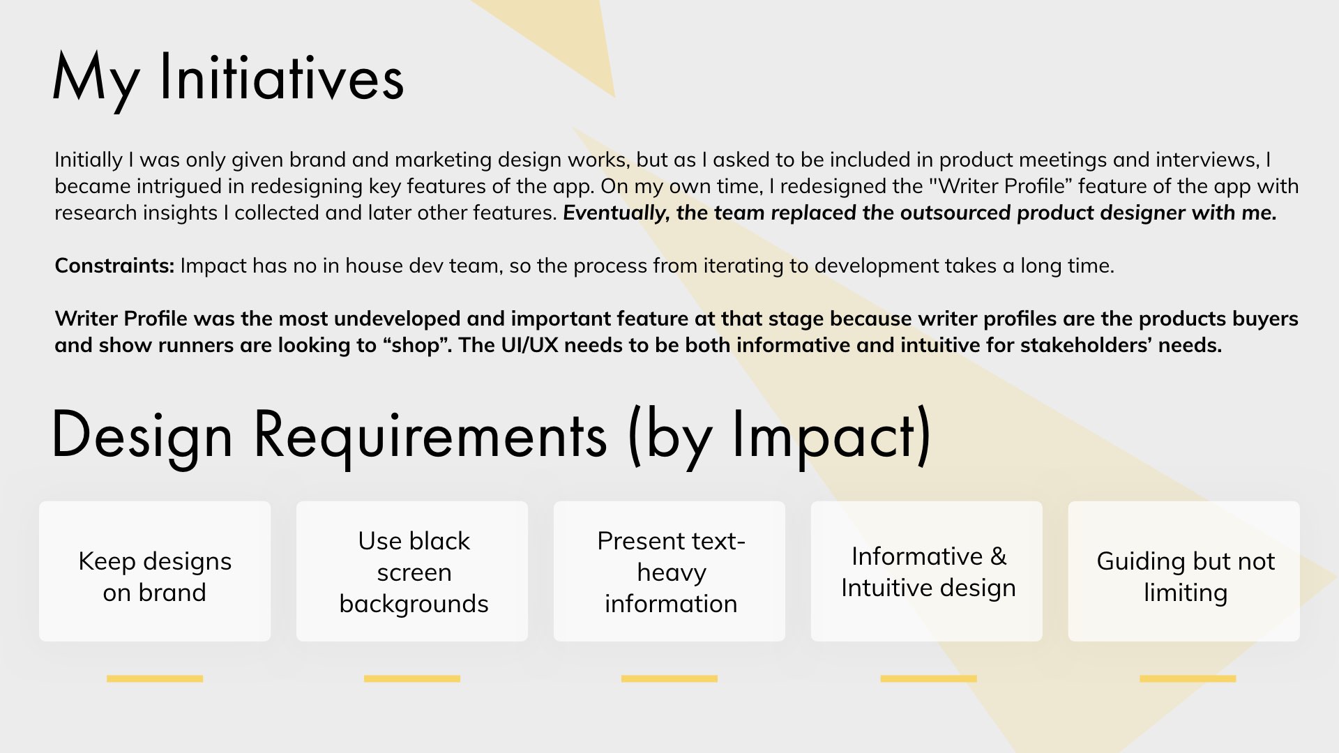 Be proactive and take initiatives at all times - initially I was outside the loop for anything related to their new app, but I was most interested in the app development, so I audited all clients meetings and asked to join all app meetings, as well as created the Writer Profile UIUX mockups after gathering insights. I then presented my concepts to the board of directors during PM meeting with Sidebench - they graciously approved my designs and claimed it was "way better than Sidebench" and they'd "want to have what I designed as the app". From then on, I was always asked to join any discussions regarding the app and pitch in ideas