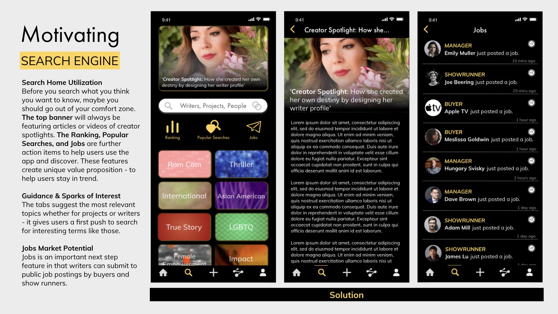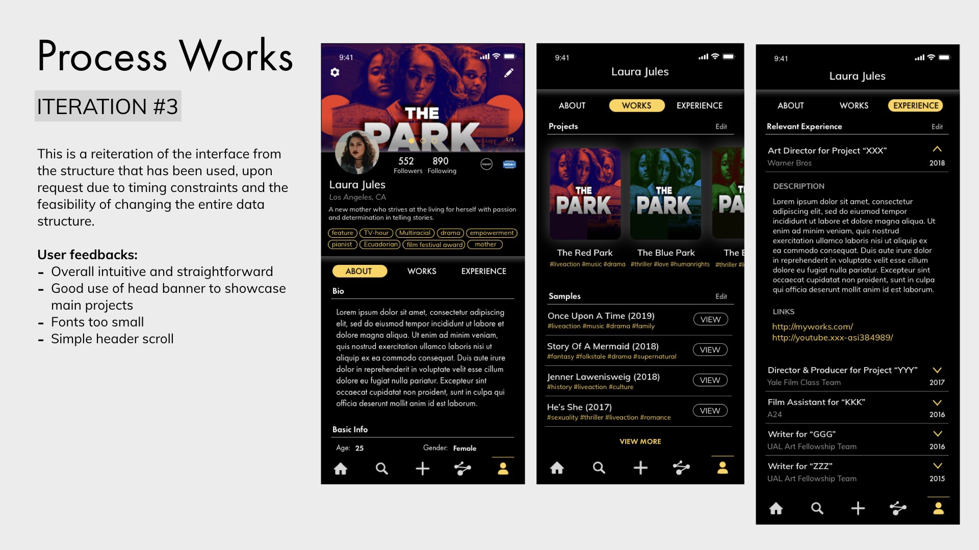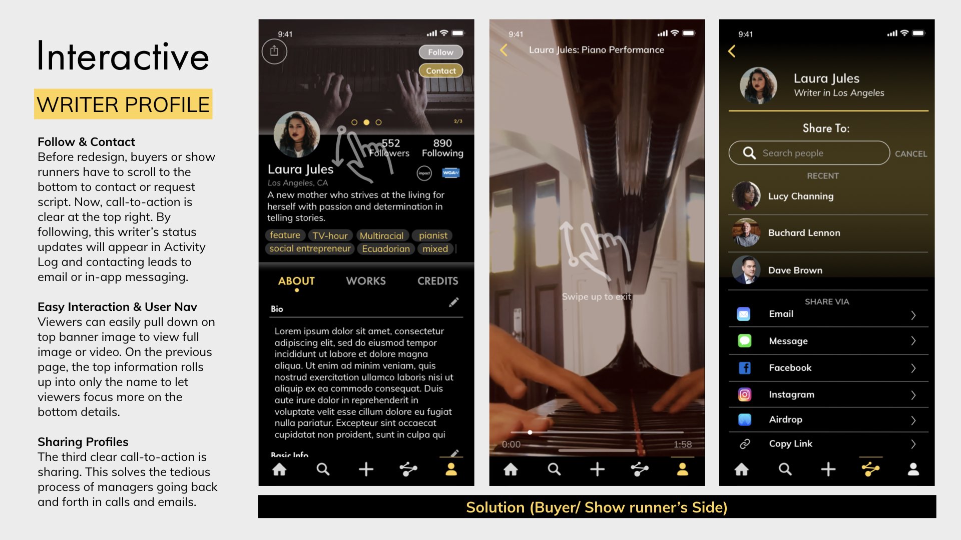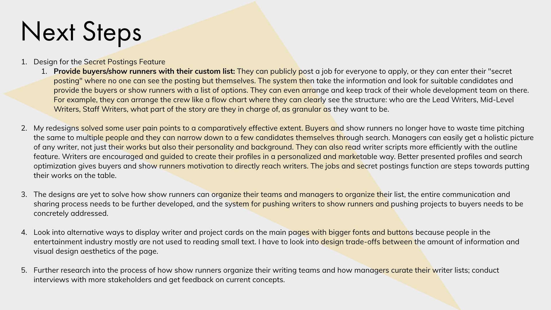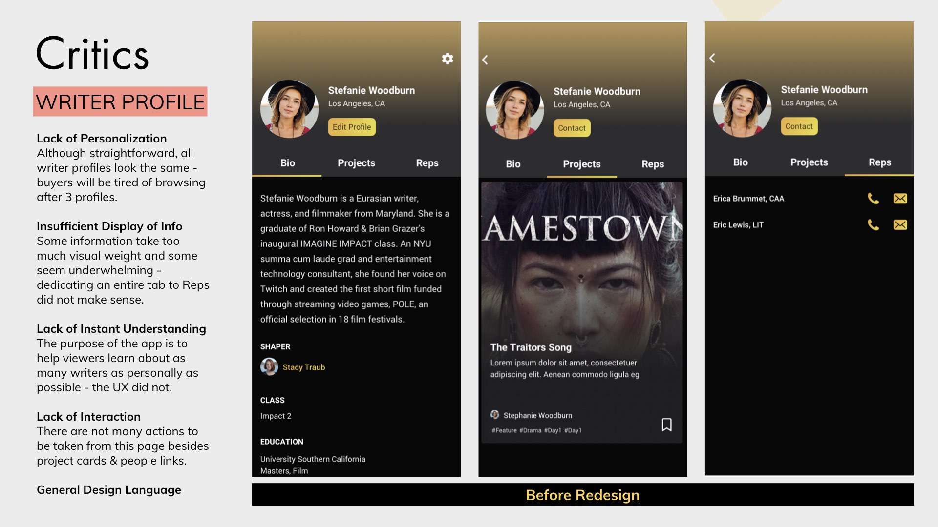 Be proactive and take initiatives at all times - initially I was outside the loop for anything related to their new app, but I was most interested in the app development, so I audited all clients meetings and asked to join all app meetings, as well as created the Writer Profile UIUX mockups after gathering insights. I then presented my concepts to the board of directors during PM meeting with Sidebench - they graciously approved my designs and claimed it was "way better than Sidebench" and they'd "want to have what I designed as the app". From then on, I was always asked to join any discussions regarding the app and pitch in ideas